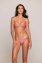 Brassiere non imbottita con ampia scollatura, le spalline sono regolabili grazie ai cursori. Giro torace regolabile grazie alla chiusura a fiocco sulla schiena. Lo slip chiuso ha una vestibilità regular sul retro, la stoffa sui fianchi è molto morbida e non segna.