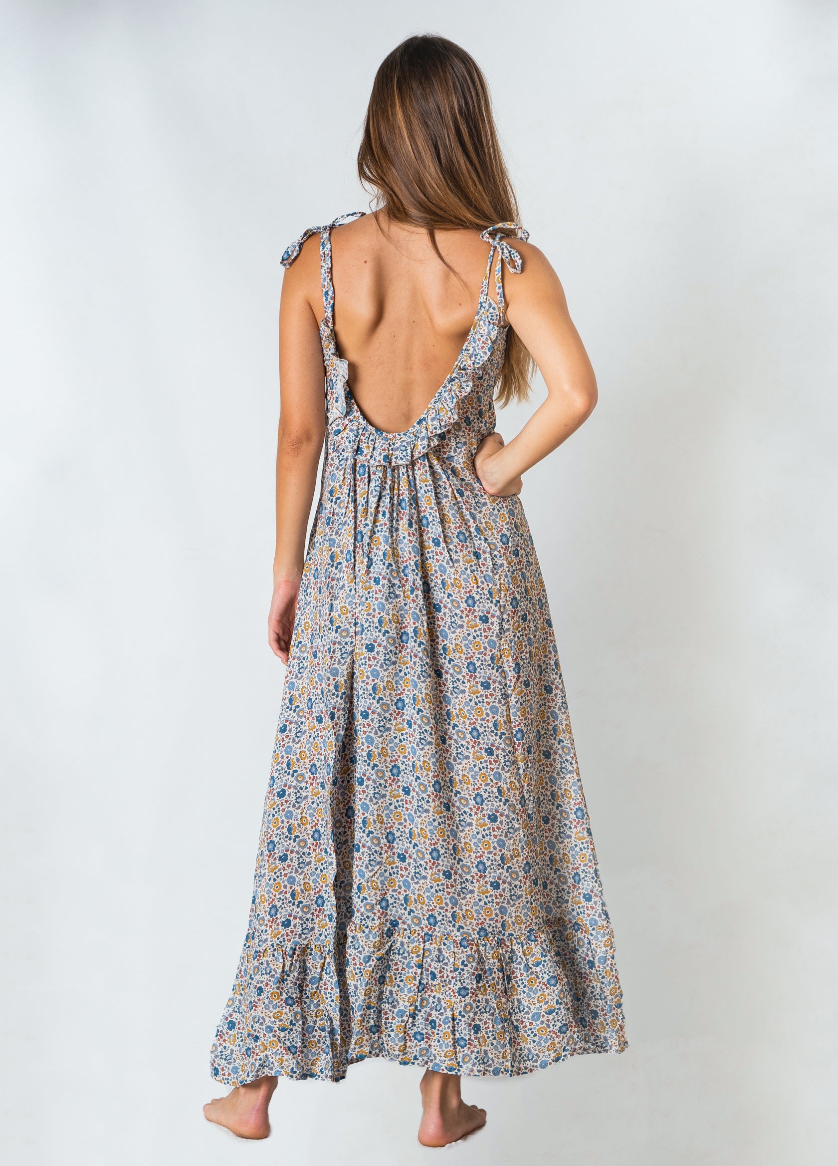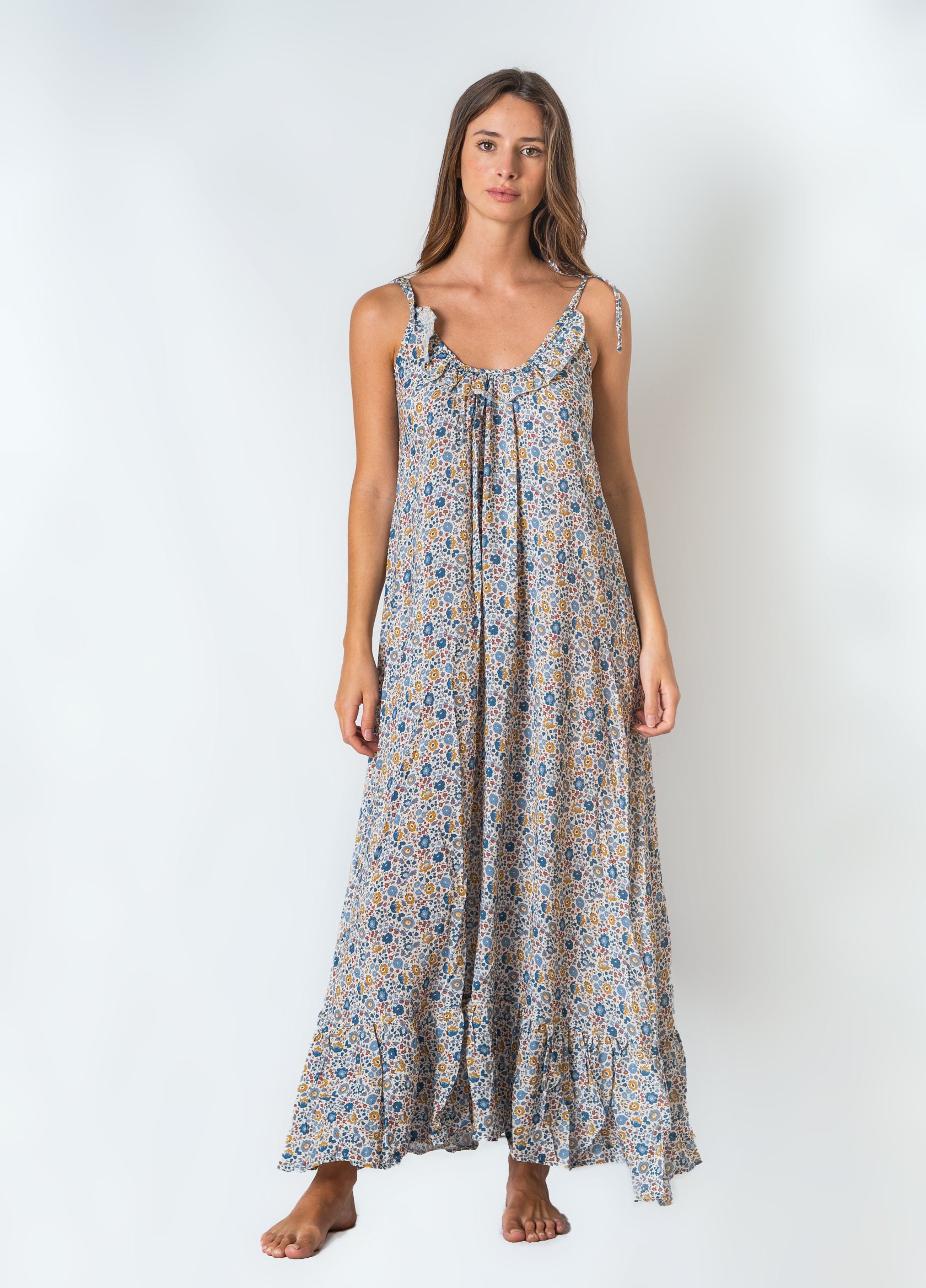 Abito lungo con spalline sottili, la lunghezza è regolabile grazie al fiocco sulle spalle. L’abito ha eleganti volant sulla scollatura e sulla balza finale. Il vestito cade morbido senza segnare in vita e lungo i fianchi.