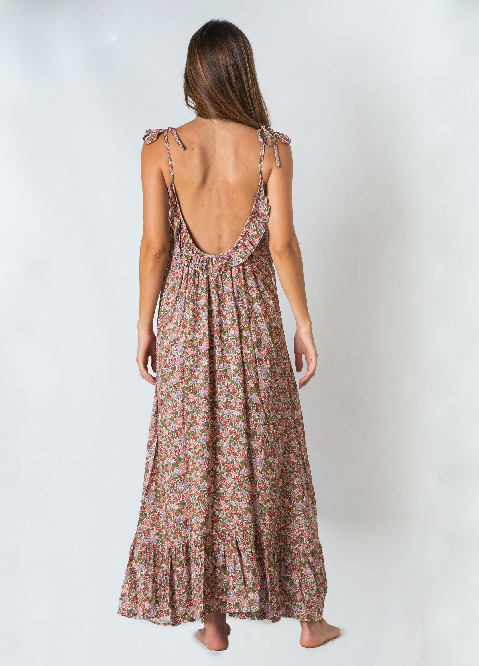 Abito lungo con spalline sottili, la lunghezza è regolabile grazie al fiocco sulle spalle. L’abito ha eleganti volant sulla scollatura e sulla balza finale. Il vestito cade morbido senza segnare in vita e lungo i fianchi.