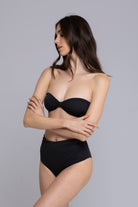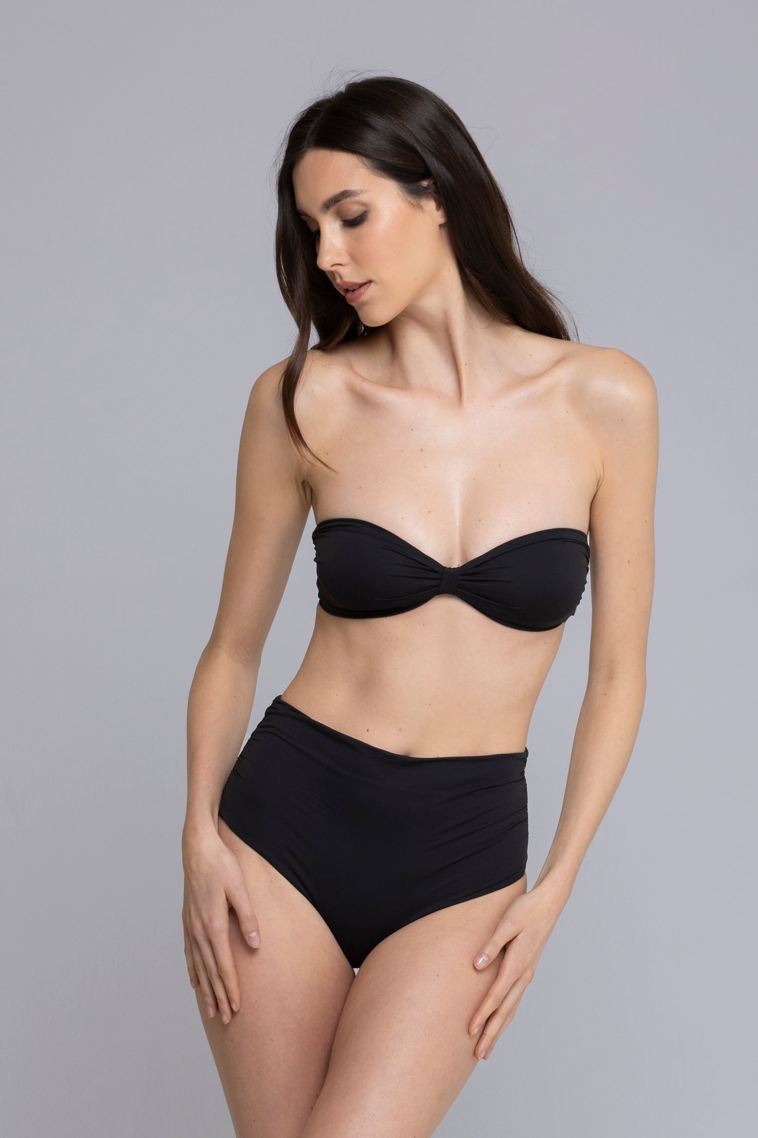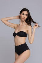 Il bikini Carillon è elegante e femminile, con slip a vita alta e delicate ruche sui fianchi. Il top a caramella, senza imbottitura, presenta un fiocco centrale e una chiusura sul retro. Il tessuto morbido avvolge la pelle con comfort, mentre il design raffinato aggiunge un tocco di classe al tuo look estivo.