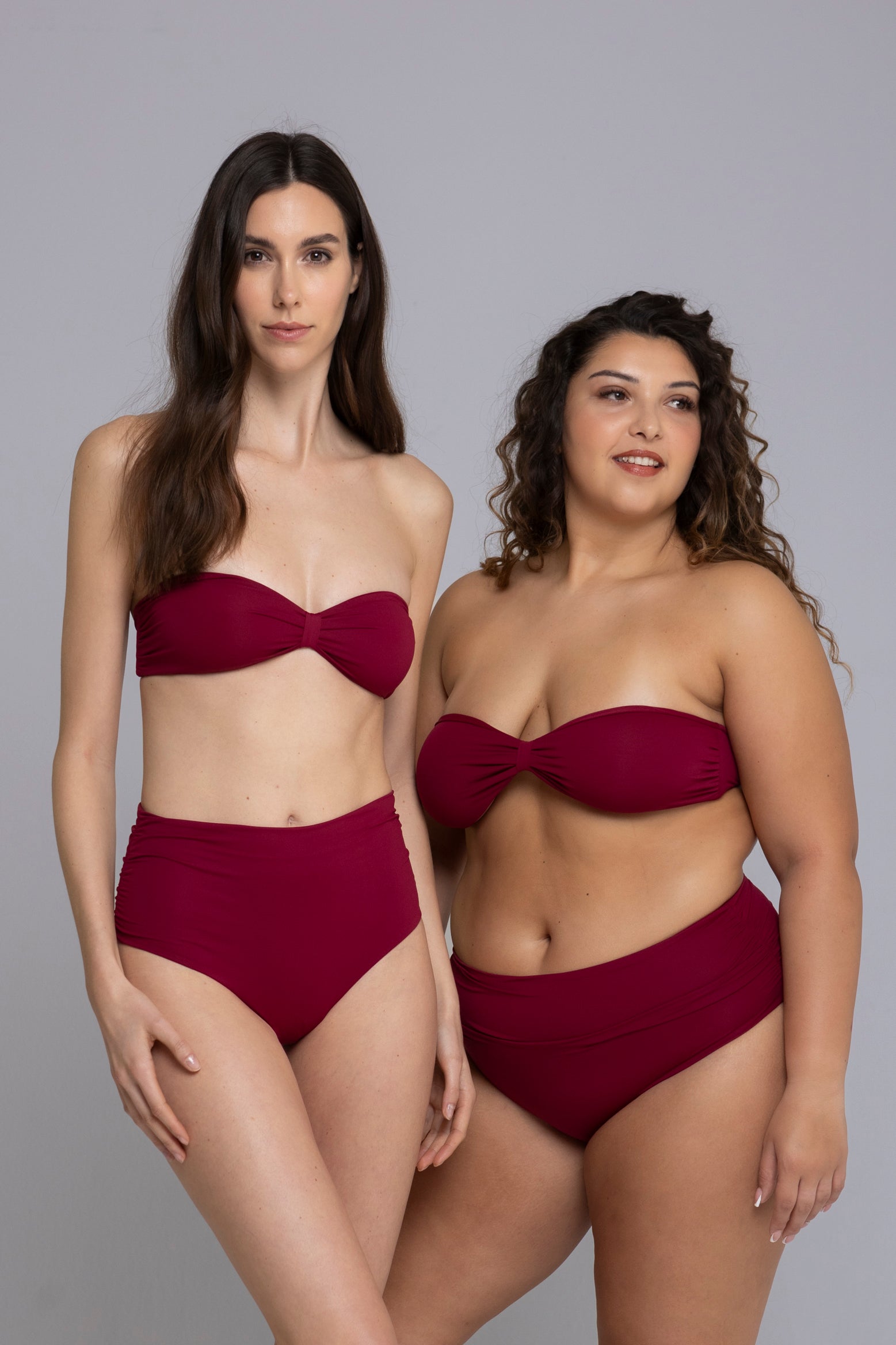 Il bikini Carillon è elegante e femminile, con slip a vita alta e delicate ruche sui fianchi. Il top a caramella, senza imbottitura, presenta un fiocco centrale e una chiusura sul retro. Il tessuto morbido avvolge la pelle con comfort, mentre il design raffinato aggiunge un tocco di classe al tuo look estivo.