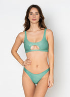 Bikini in tessuto lurex. Il top a brassiere ha dettagli cut out al centro del seno, il girotorace e le spalline non sono regolabili. Lo slip è chiuso e regular sul retro.
