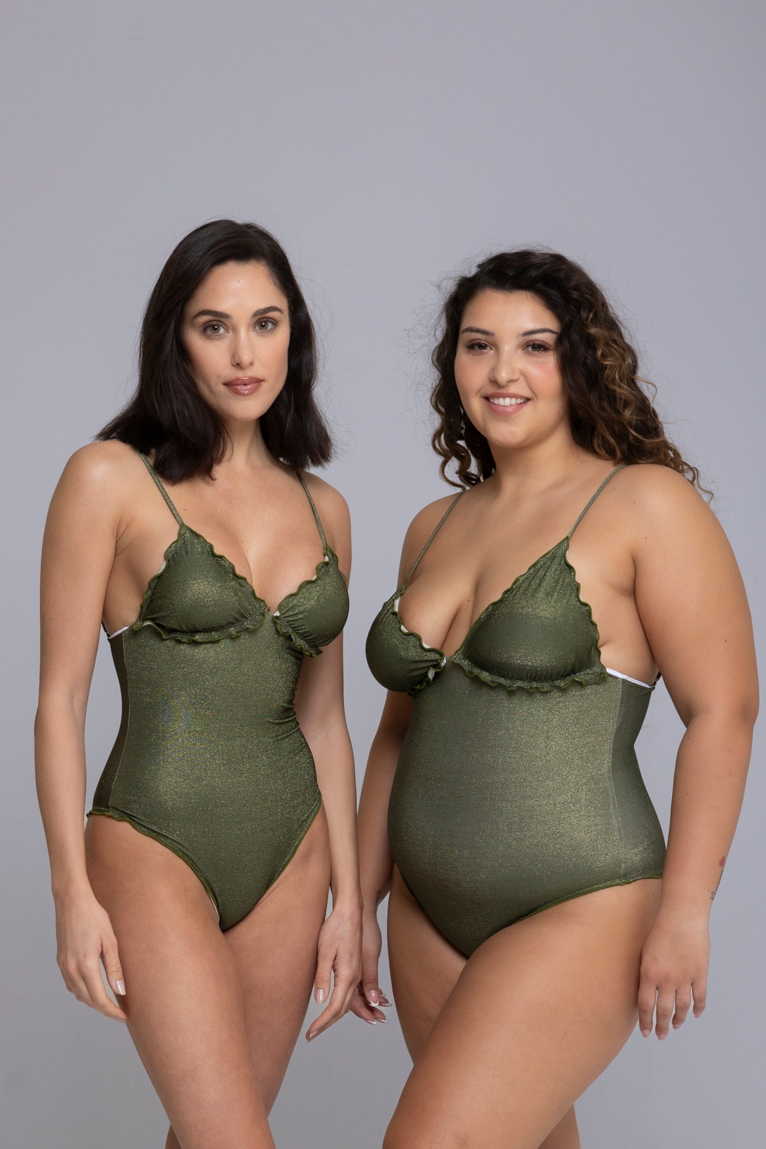 Tutto il fascino del bikini Frufru, racchiuso in un costume intero femminile e confortevole. Realizzato in morbido tessuto arricciato lungo i bordi, accarezza il corpo senza segnare. Le coppe a triangolo con imbottitura removibile valorizzano il décolleté con uno scollo a V elegante. Le spalline sottili sono regolabili grazie al cursore per garantire una vestibilità perfetta. Il retro presenta una sgambatura morbida e una vestibilità regular, pensata per adattarsi naturalmente alle forme.