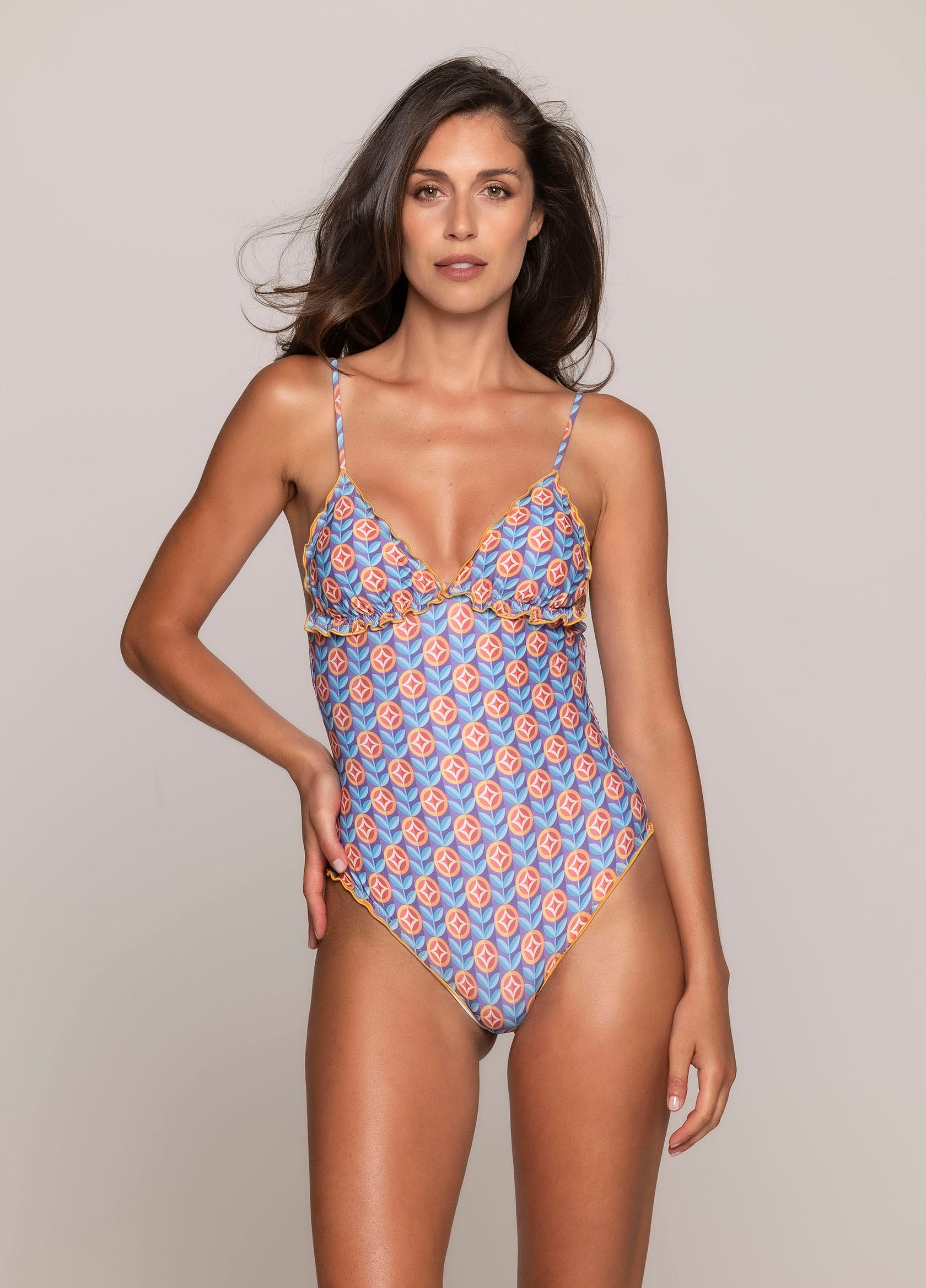 Frufru: il nostro modello più amato, nella versione intero. Un costume dalla morbida stoffa arricciata lungo i bordi. Le coppe sono a triangolo con pratica imbottitura removibile, lo scollo a V, e la lunghezza delle spalline sottili è regolabile grazie al cursore. La vestibilità sul retro è di uno slip regular leggermente sgambato.
