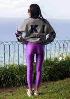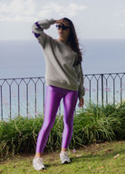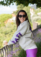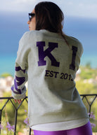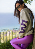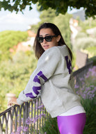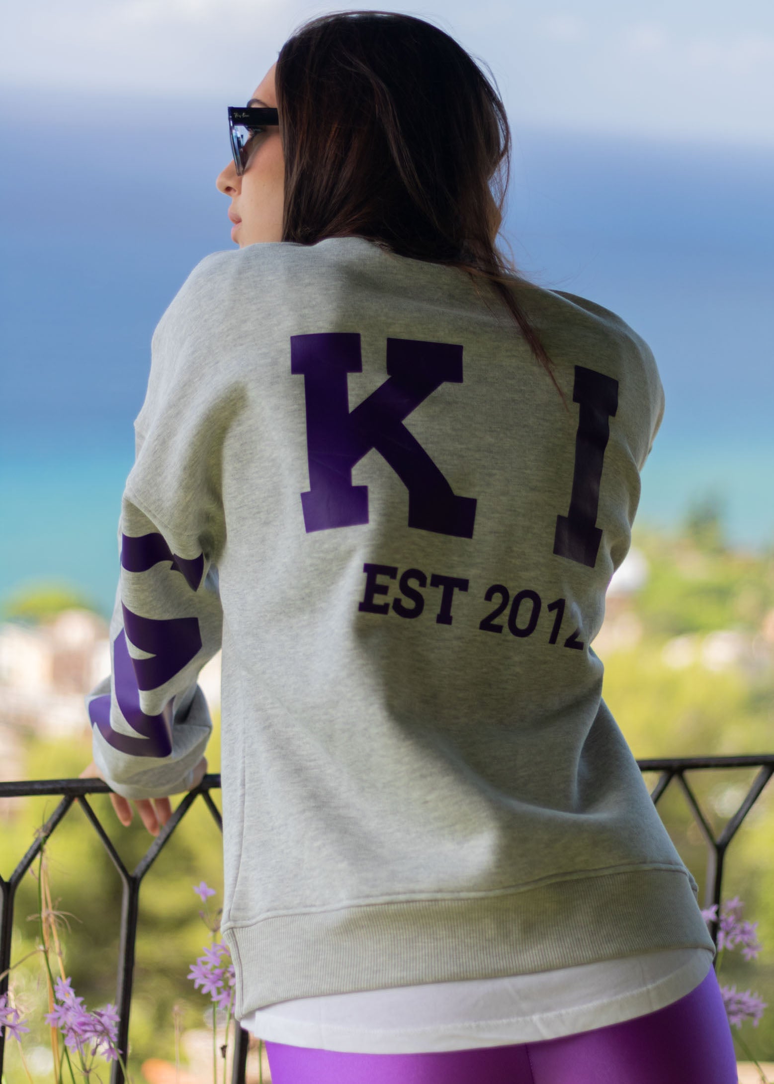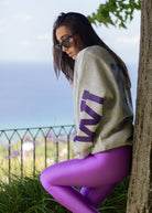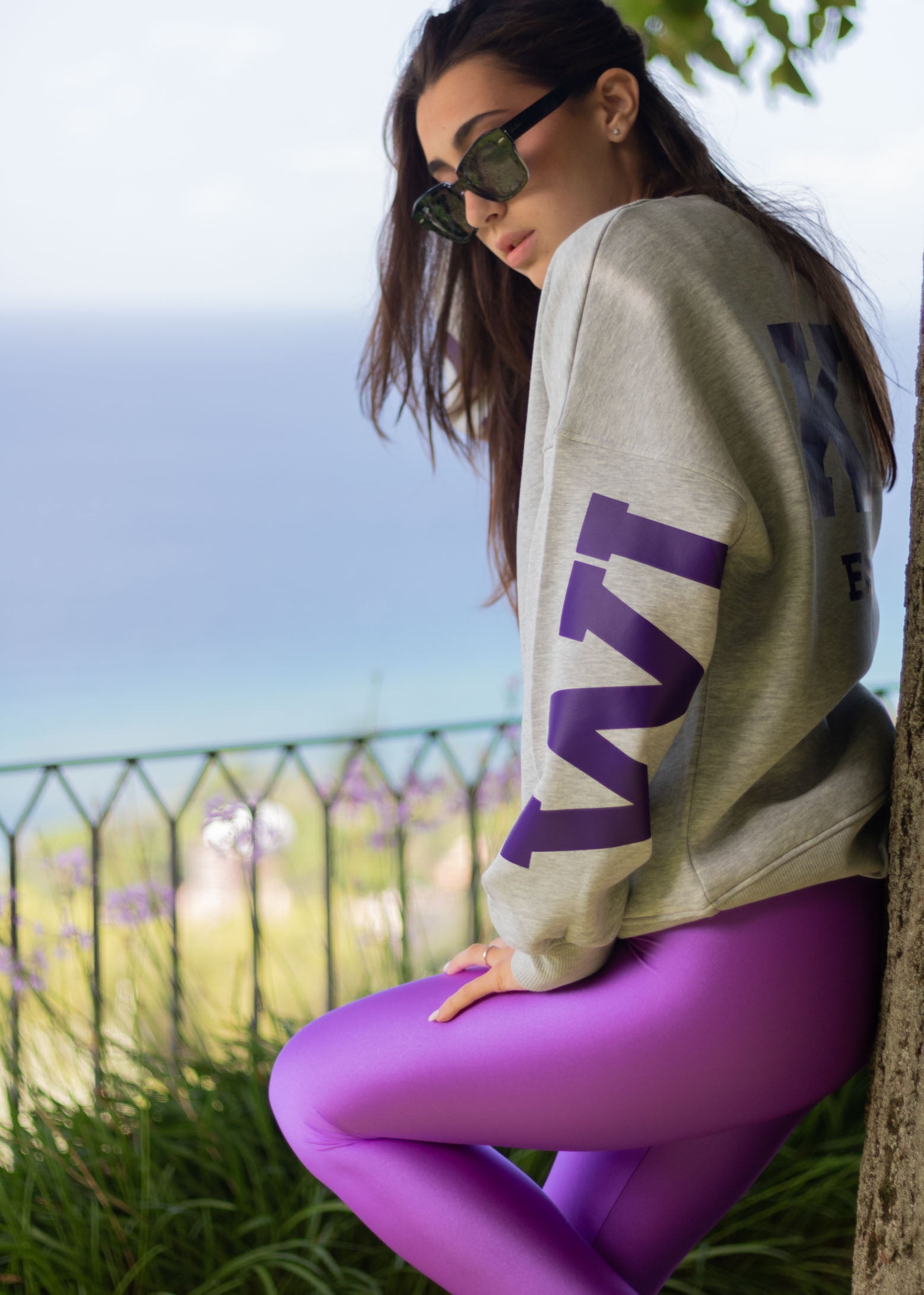 Felpa girocollo vestibilità oversize. Grigio melange con stampa violetto "WIKINI est 2012" sul retro
