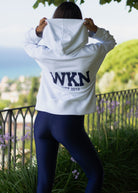 Felpa garzata grigio bianca con stampa blu sul retro "WKN EST 2012"