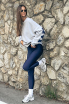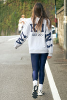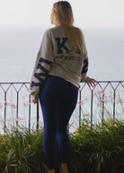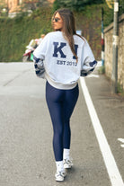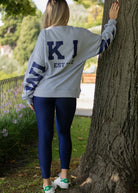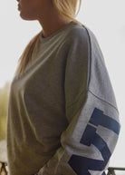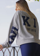 Felpa girocollo garzata vestibilità oversize. Grigio melange con stampa blu scuro "WIKINI est 2012" sul retro