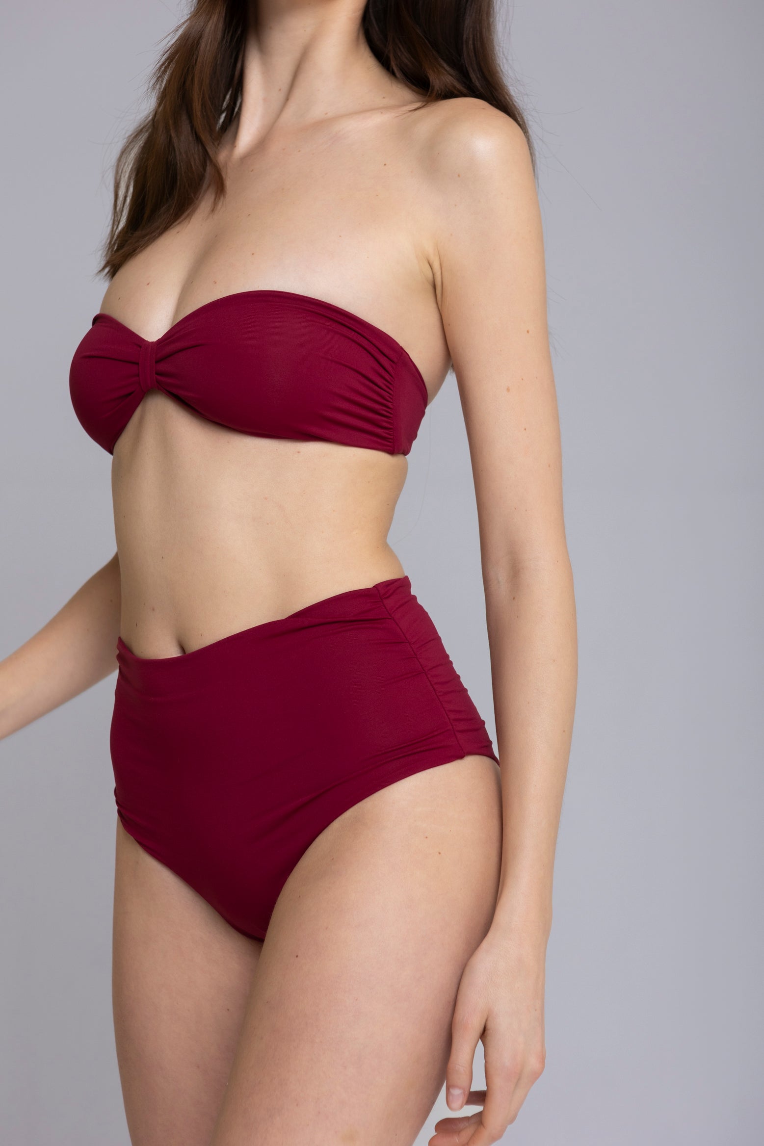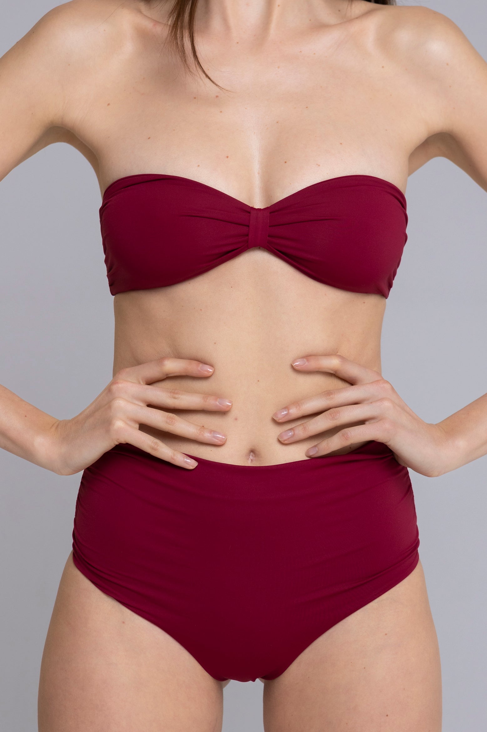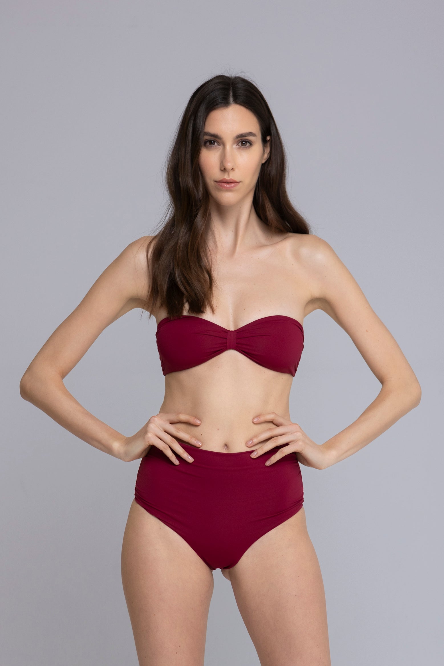 Il bikini Carillon è elegante e femminile, con slip a vita alta e delicate ruche sui fianchi. Il top a caramella, senza imbottitura, presenta un fiocco centrale e una chiusura sul retro. Il tessuto morbido avvolge la pelle con comfort, mentre il design raffinato aggiunge un tocco di classe al tuo look estivo.