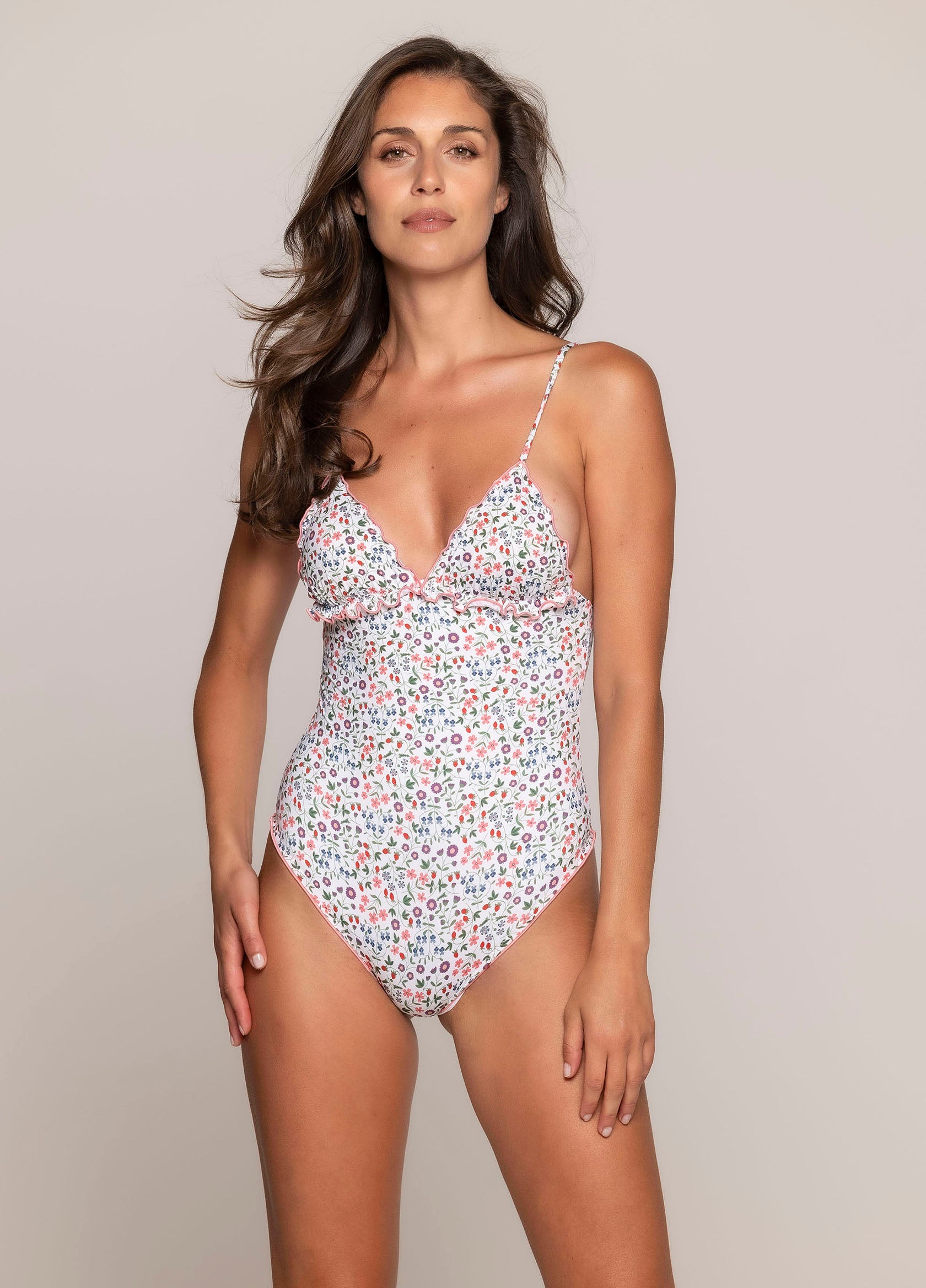 Frufru: il nostro modello più amato, nella versione intero. Un costume dalla morbida stoffa arricciata lungo i bordi. Le coppe sono a triangolo con pratica imbottitura removibile, lo scollo a V, e la lunghezza delle spalline sottili è regolabile grazie al cursore. La vestibilità sul retro è di uno slip regular leggermente sgambato.