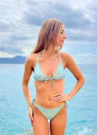 Alice è un bikini composto da top a triangolo dall'allacciatura con fiocco al centro del seno e imbottitura removibile. Lo slip è regular, con laccetti sottili sui fianchi che permettono di regolare la vestibilità in vita.