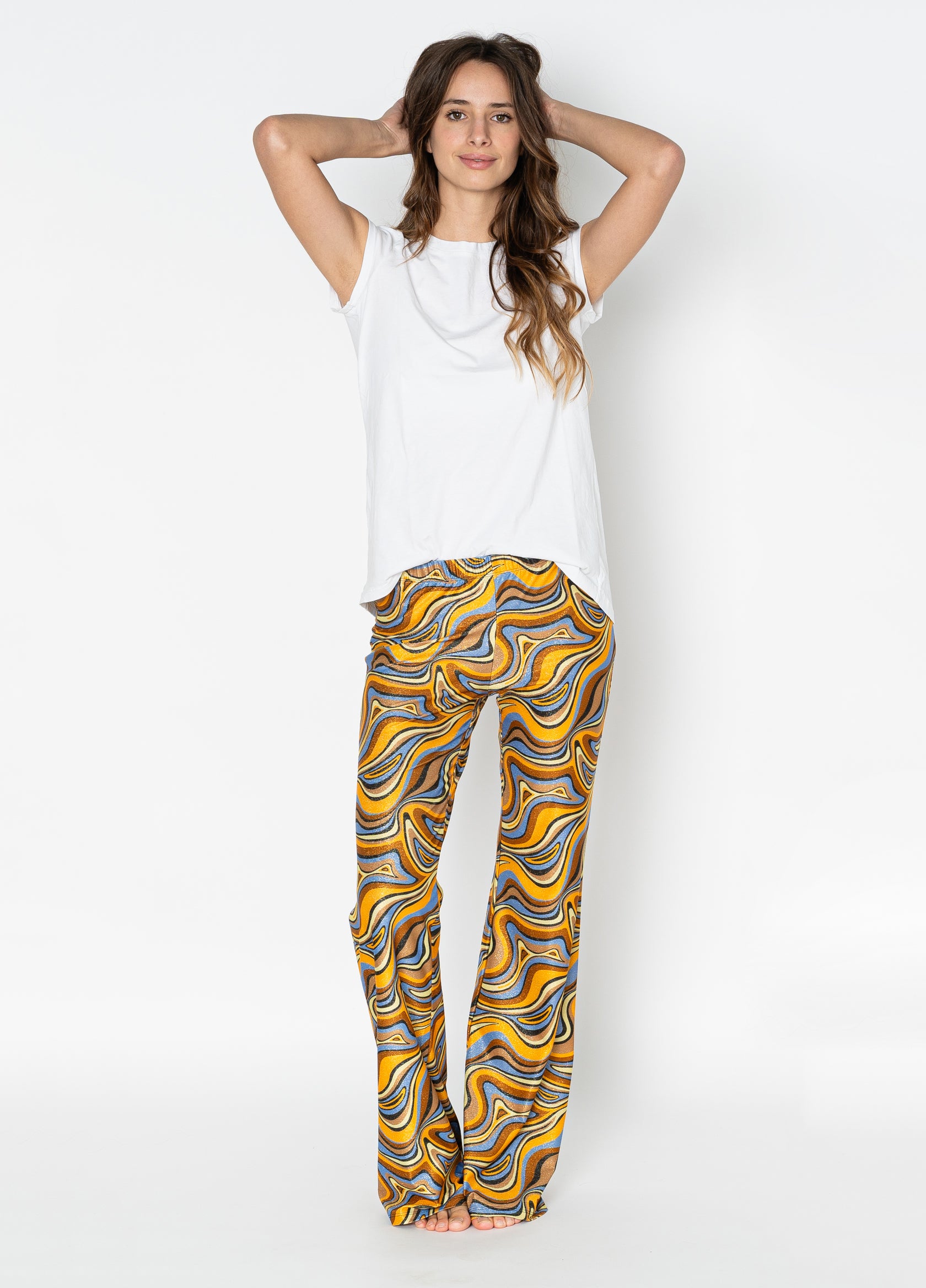 Pantaloni lunghi, modello flare, con elastico in vita. Il tessuto lycra dall’asciugatura rapida, li rende perfetti per ogni occasione!