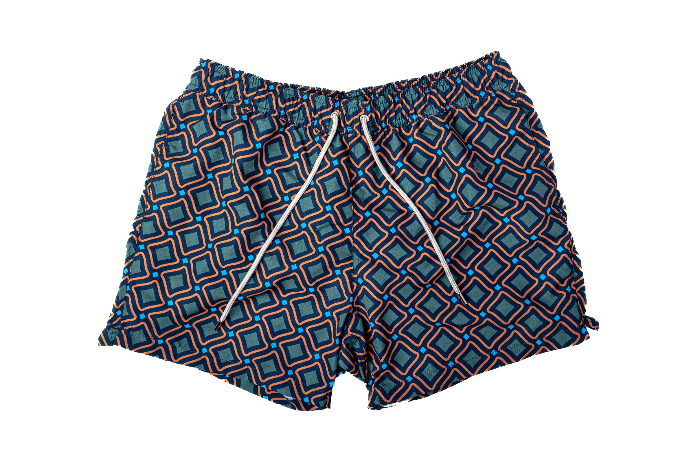 Costume da uomo a pantaloncino con elastico in vita e laccetto per regolare la vestibilità. Tasche laterali aperte ed una tasca posteriore con chiusura a bottone
