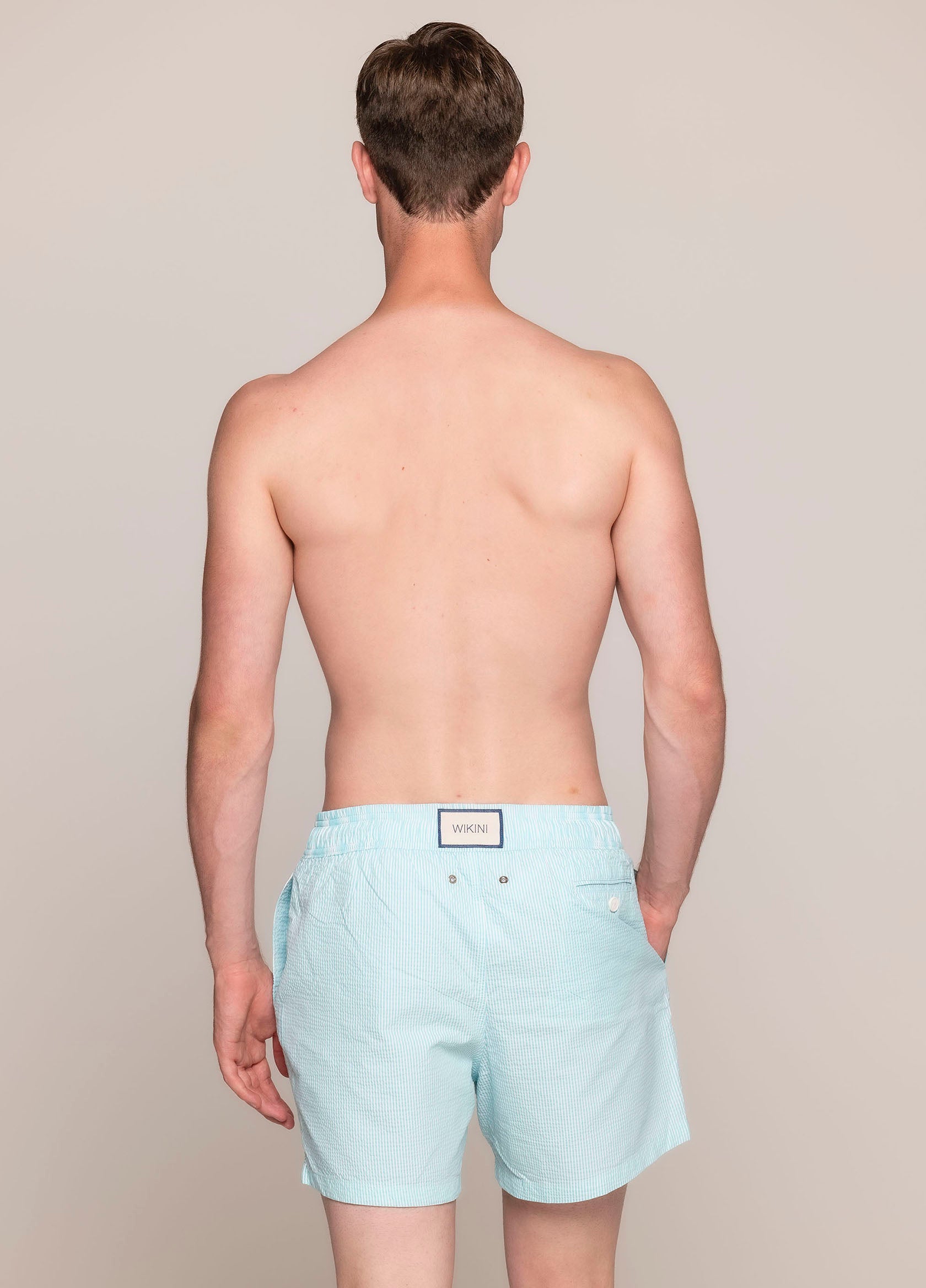 Costume da uomo a pantaloncino con elastico in vita e laccetto per regolare la vestibilità. Tasche laterali aperte ed una tasca posteriore con chiusura a bottone