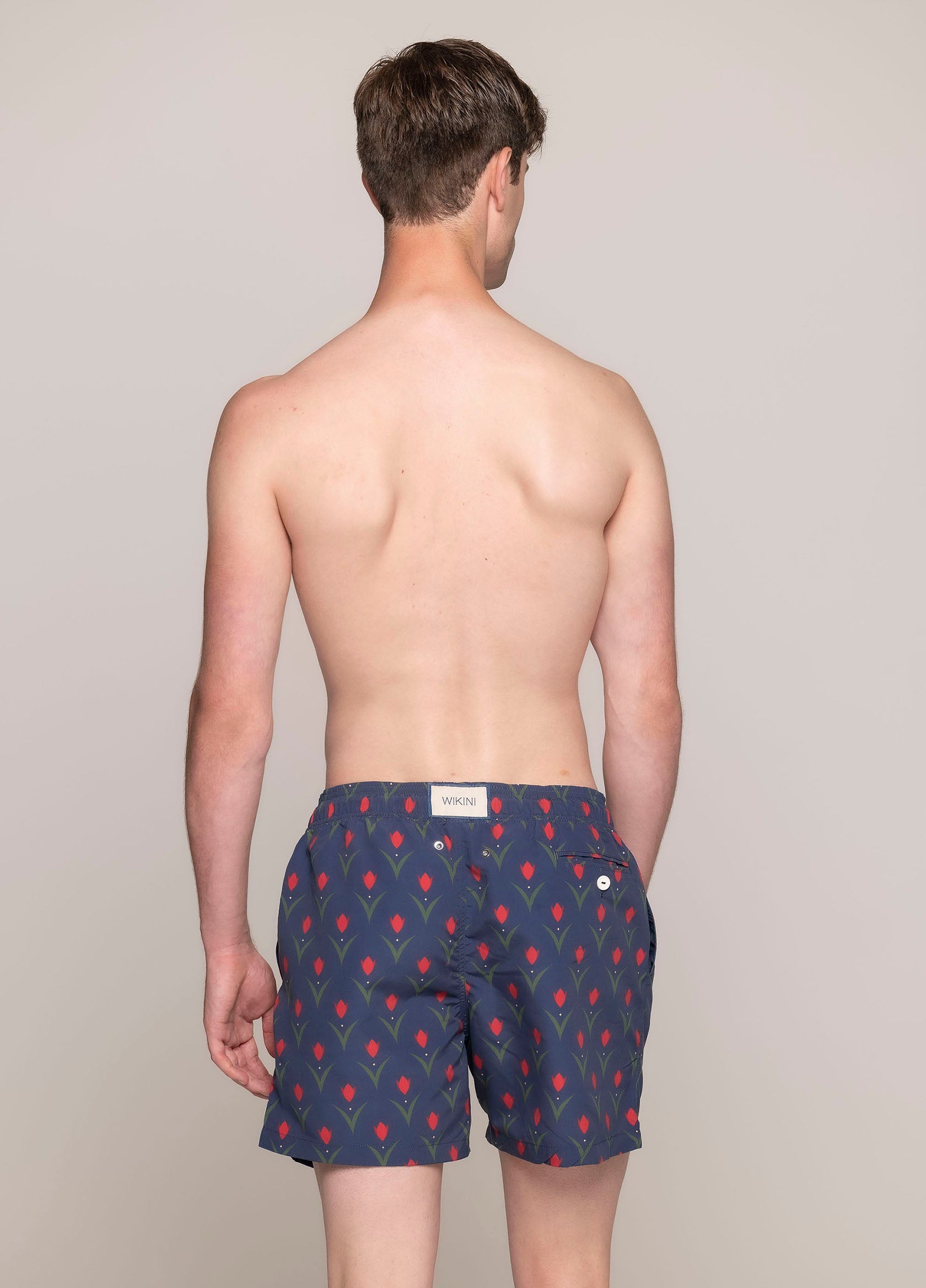 Costume da uomo a pantaloncino con elastico in vita e laccetto per regolare la vestibilità. Tasche laterali aperte ed una tasca posteriore con chiusura a bottone