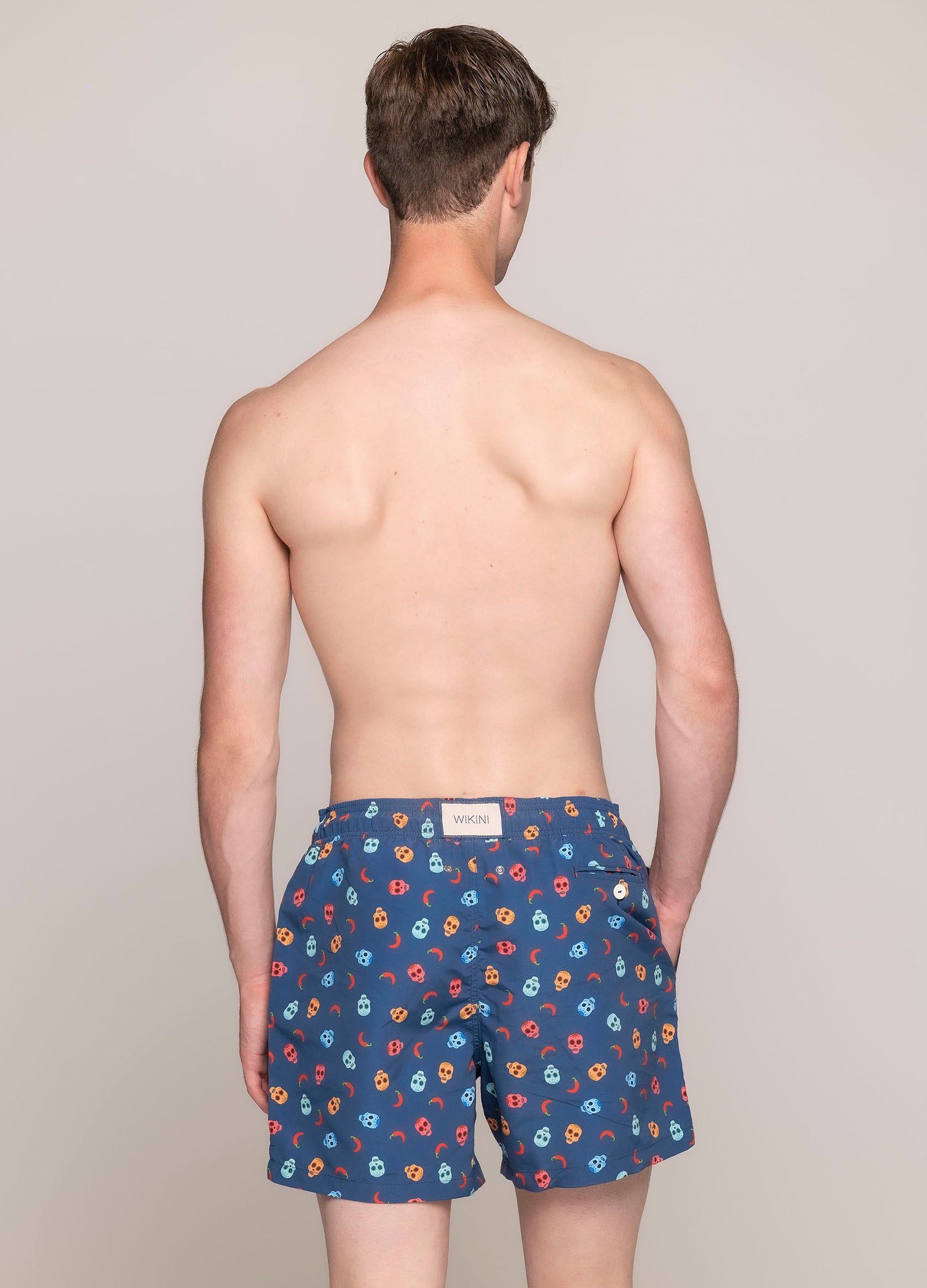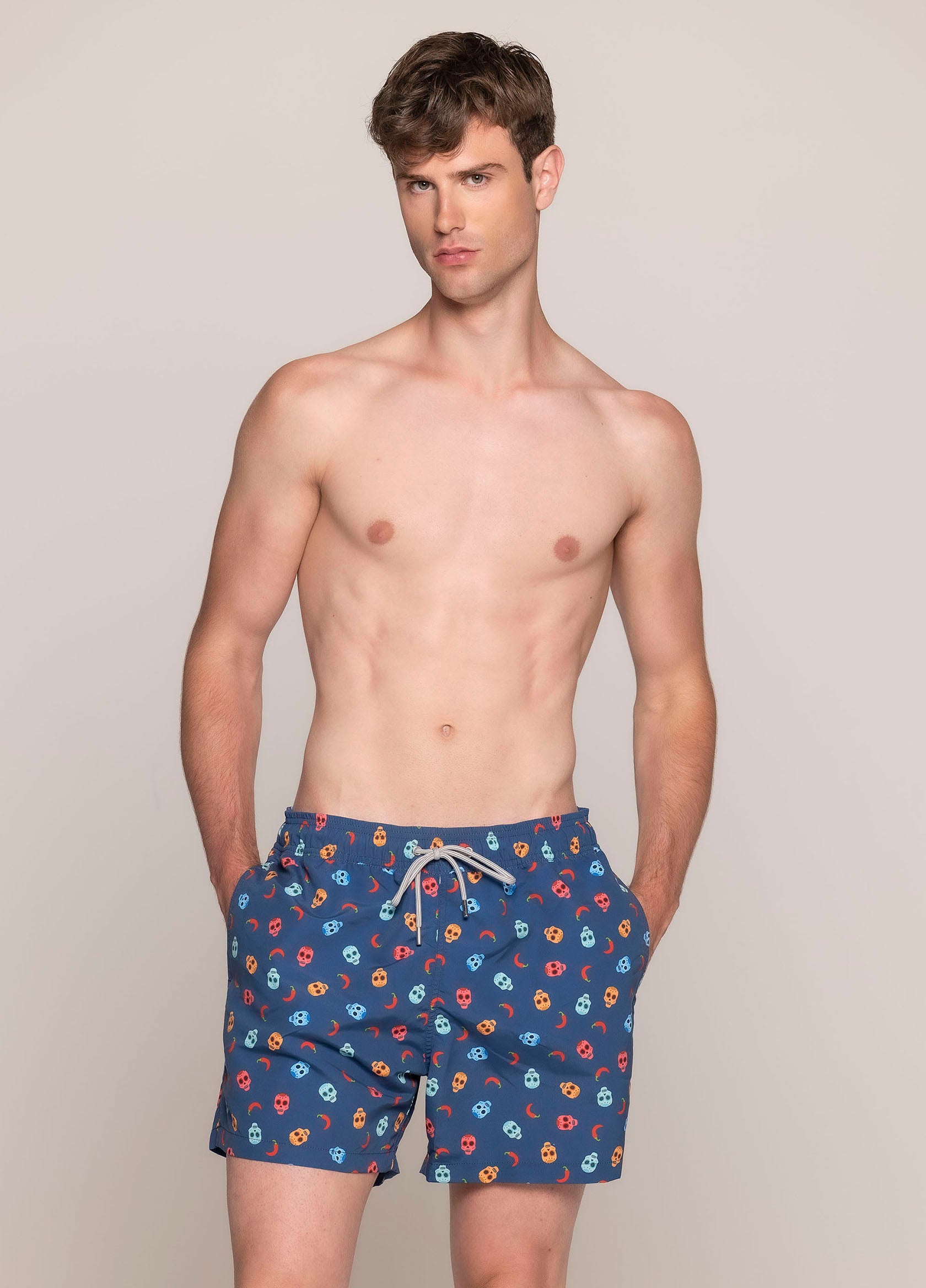 Costume da uomo a pantaloncino con elastico in vita e laccetto per regolare la vestibilità. Tasche laterali aperte ed una tasca posteriore con chiusura a bottone