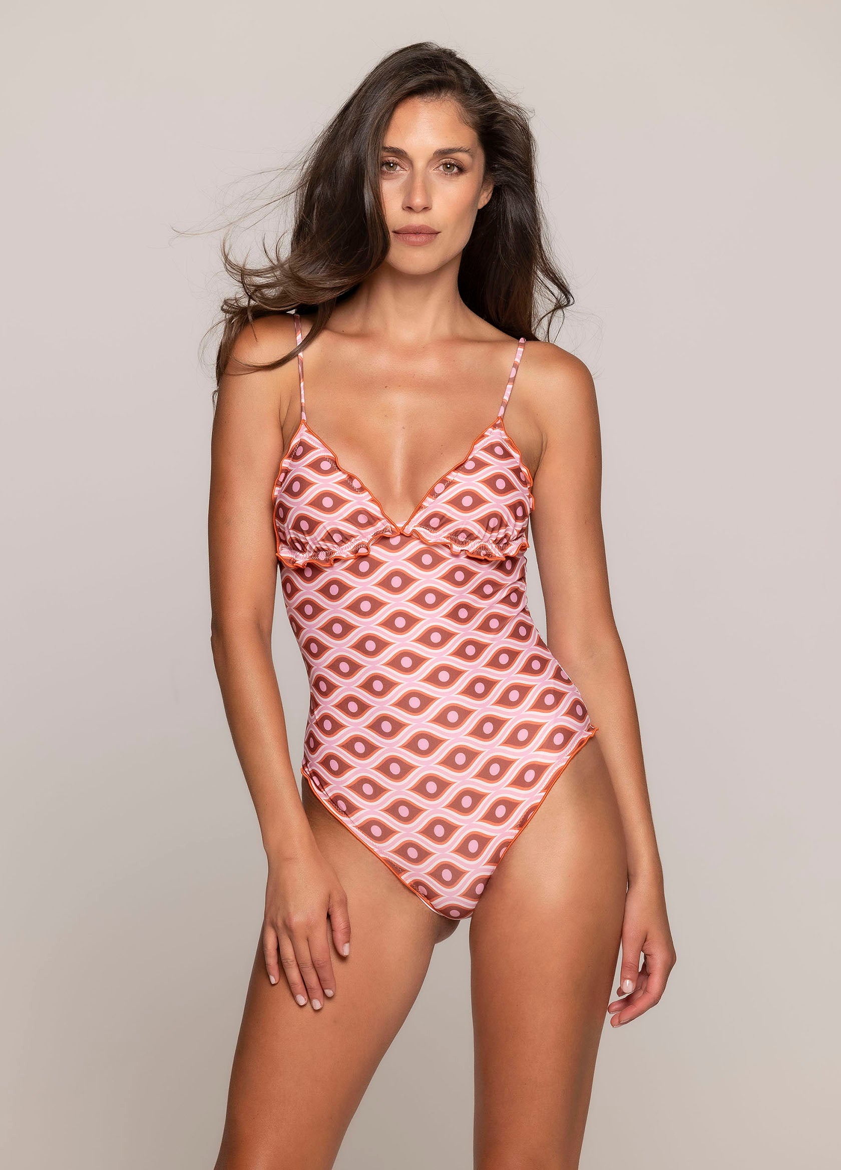 Frufru: il nostro modello più amato, nella versione intero. Un costume dalla morbida stoffa arricciata lungo i bordi. Le coppe sono a triangolo con pratica imbottitura removibile, lo scollo a V, e la lunghezza delle spalline sottili è regolabile grazie al cursore. La vestibilità sul retro è di uno slip regular leggermente sgambato.