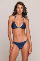 Bikini con top a triangolo scorrevole con imbottitura removibile, le doppie spalline si incrociano per chiudersi dietro al collo e sulla schiena. Slip chiuso con dettaglio cut-out sui fianchi dalla vestibilità regular.