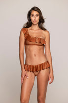 Top monospalla con volant sulla spallina e allacciatura con fiocco sulla schiena per regolare il giro torace. Le coppe imbottite sono removibili per permettere massimo comfort.