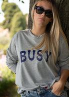 T-shirt manica lunga grigia con stampa blu BUSY