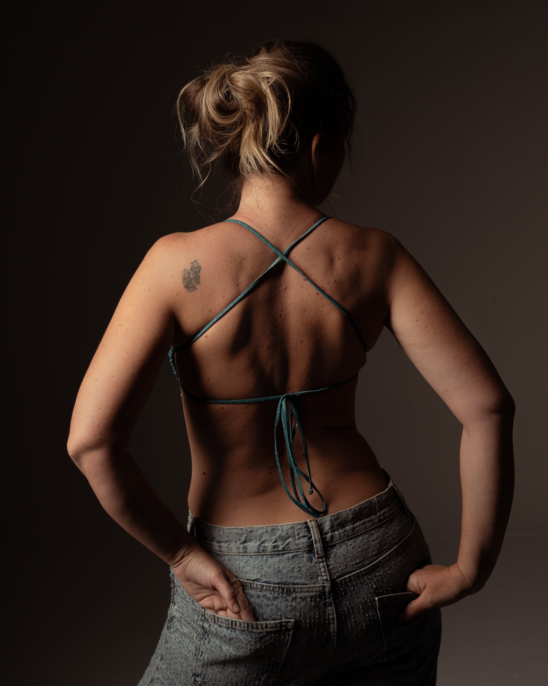 Bikini with thin ties. The brassiere top has removable padding, the straps cross behind the neck and then close with a bow at the back. The bikini bottom closes at the hips with ties and has a regular fit.