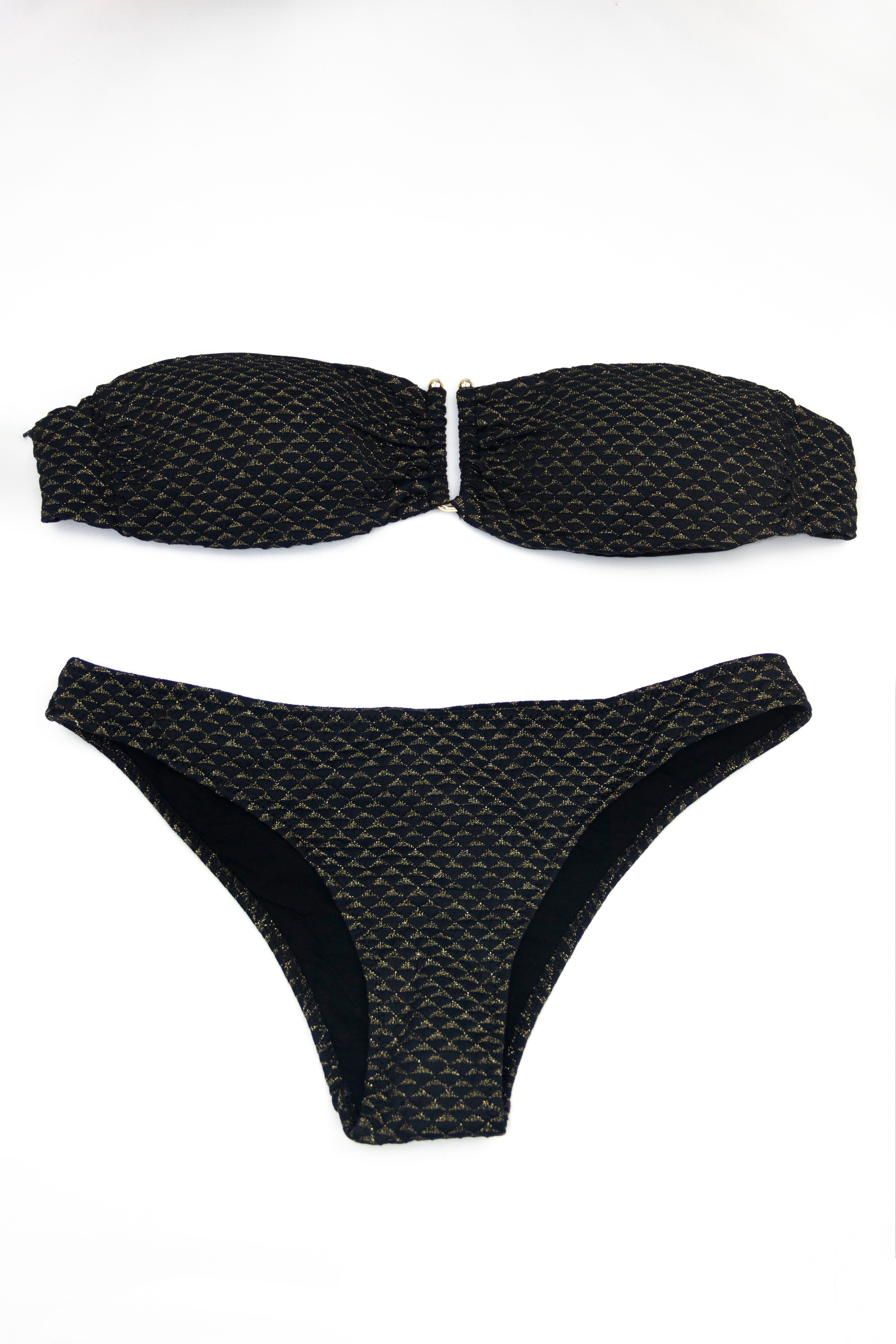 Amy is a two-piece bikini with a gold metal U-shaped insert in the center of the breast.