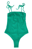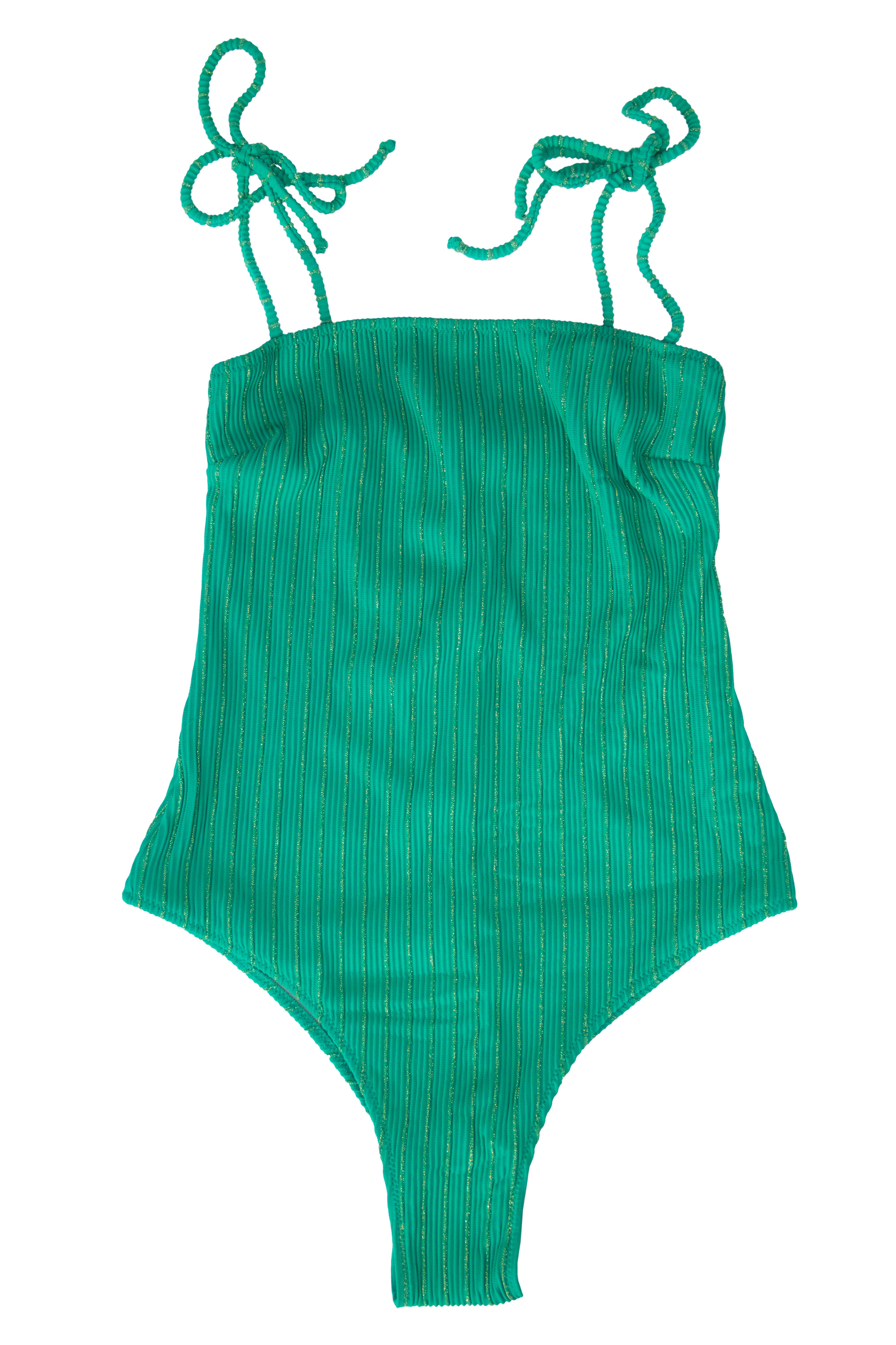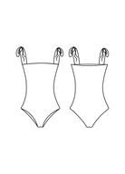 One-piece, square-necked, unpadded swimsuit featuring bow straps on the shoulders that allow for length adjustment. Regular fit in the bottom, slightly shirred