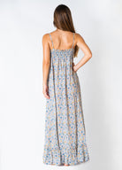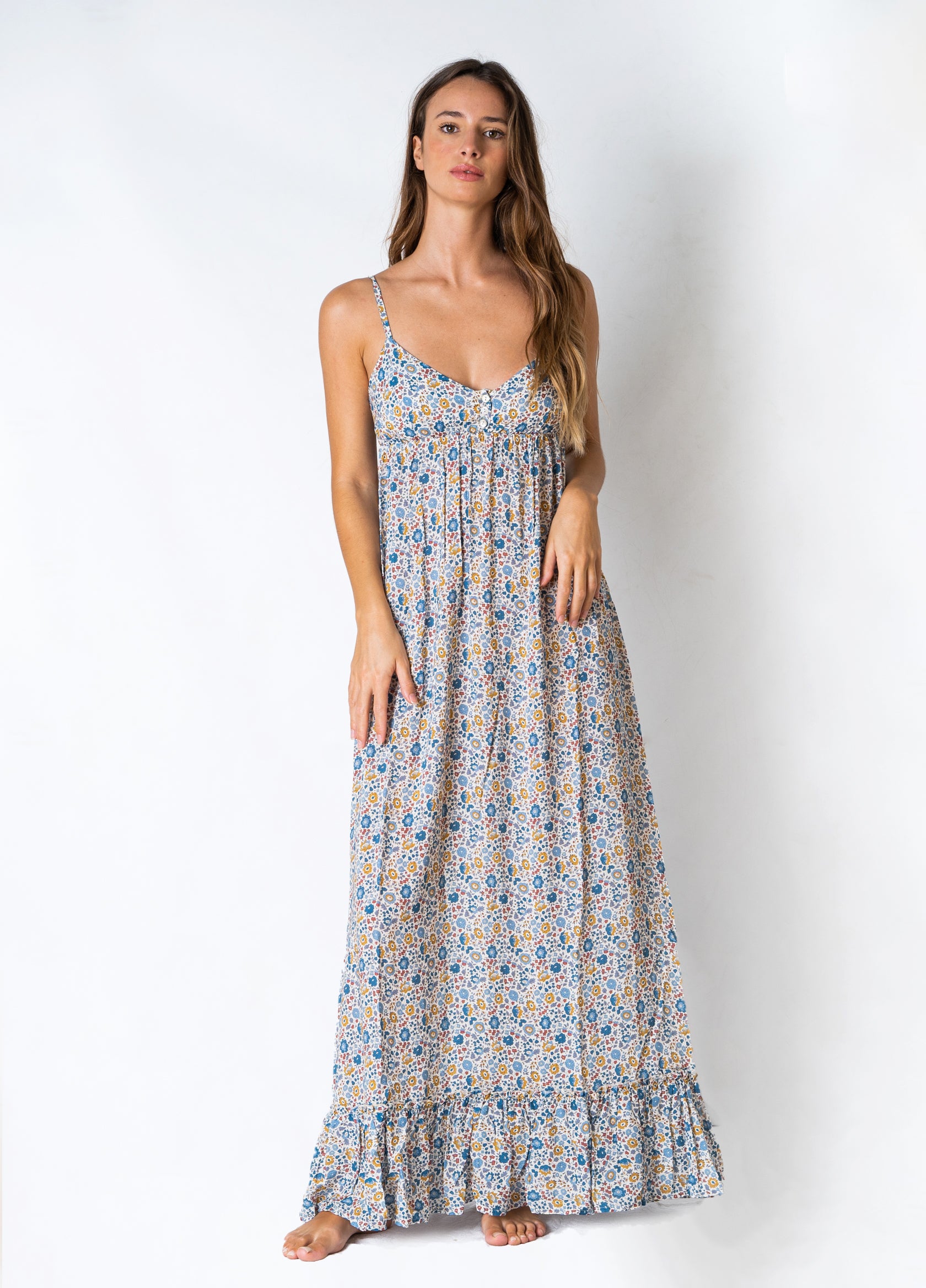 Abito estivo lungo, fantasia liberty floreale con graziose spalline sottili regolabili grazie al cursore.