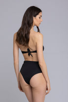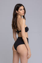 Il bikini Carillon è elegante e femminile, con slip a vita alta e delicate ruche sui fianchi. Il top a caramella, senza imbottitura, presenta un fiocco centrale e una chiusura sul retro. Il tessuto morbido avvolge la pelle con comfort, mentre il design raffinato aggiunge un tocco di classe al tuo look estivo.