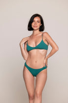 Brassiere non imbottita con ampia scollatura, le spalline sono regolabili grazie ai cursori. Giro torace regolabile grazie alla chiusura a fiocco sulla schiena. Lo slip chiuso ha una vestibilità regular sul retro, la stoffa sui fianchi è molto morbida e non segna.