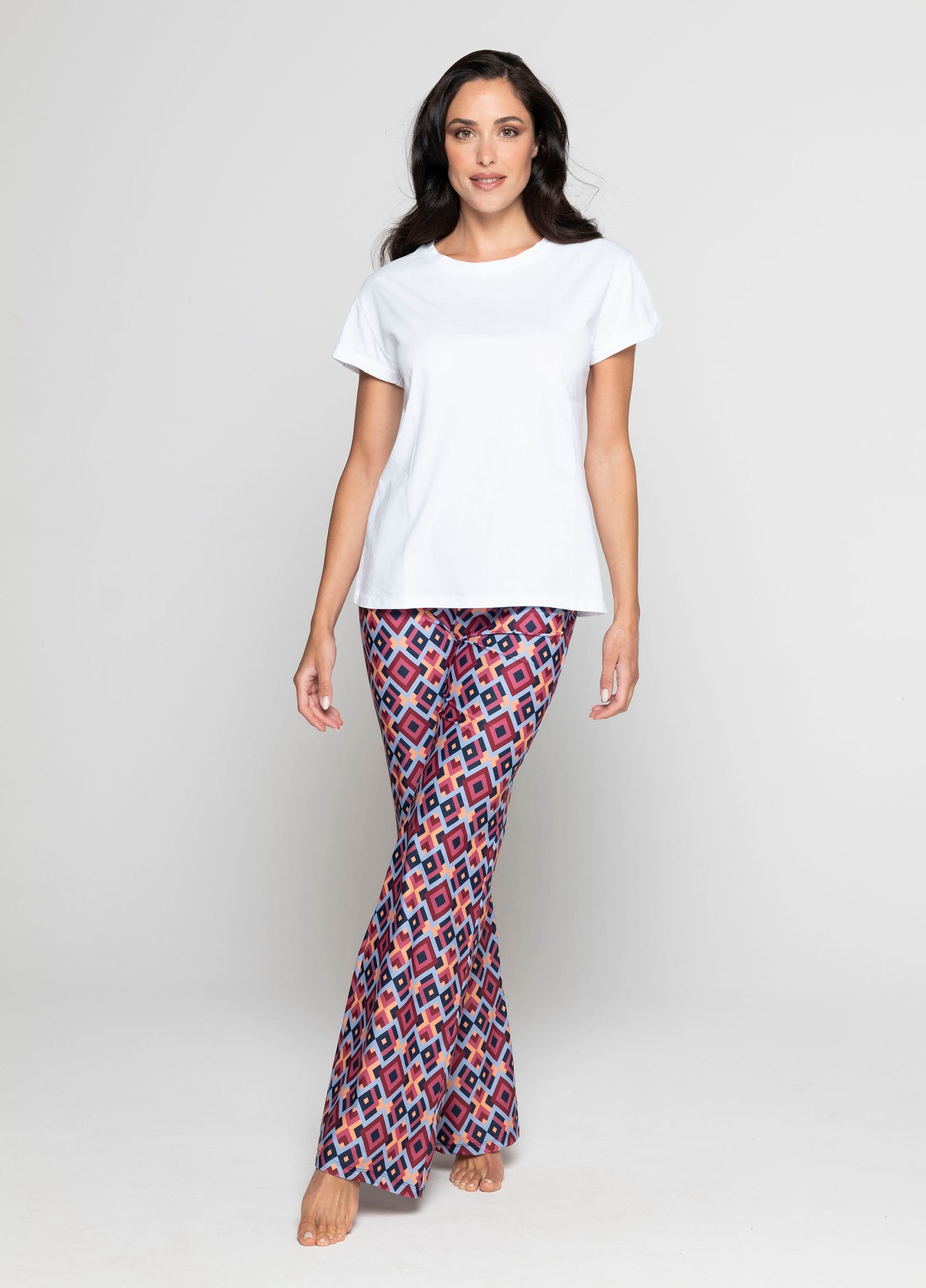 Pantaloni in lycra lunghi, modello flare, con elastico in vita. Il tessuto lycra dall’asciugatura rapida, li rende perfetti per le giornate estive. Fantasie abbinabili ai frufu interi o bikini.
