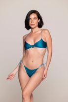 Il top a brassiere ha spalline sottili in rasatello ed è caratterizzato da un nodo al centor del seno, la chiusura è a fiocco sulla schiena. Le spalline non sono regolabili, coppe non imbottite. Lo slip è leggermente sgambato esi chiude con laccetti sottili sui fianchi.