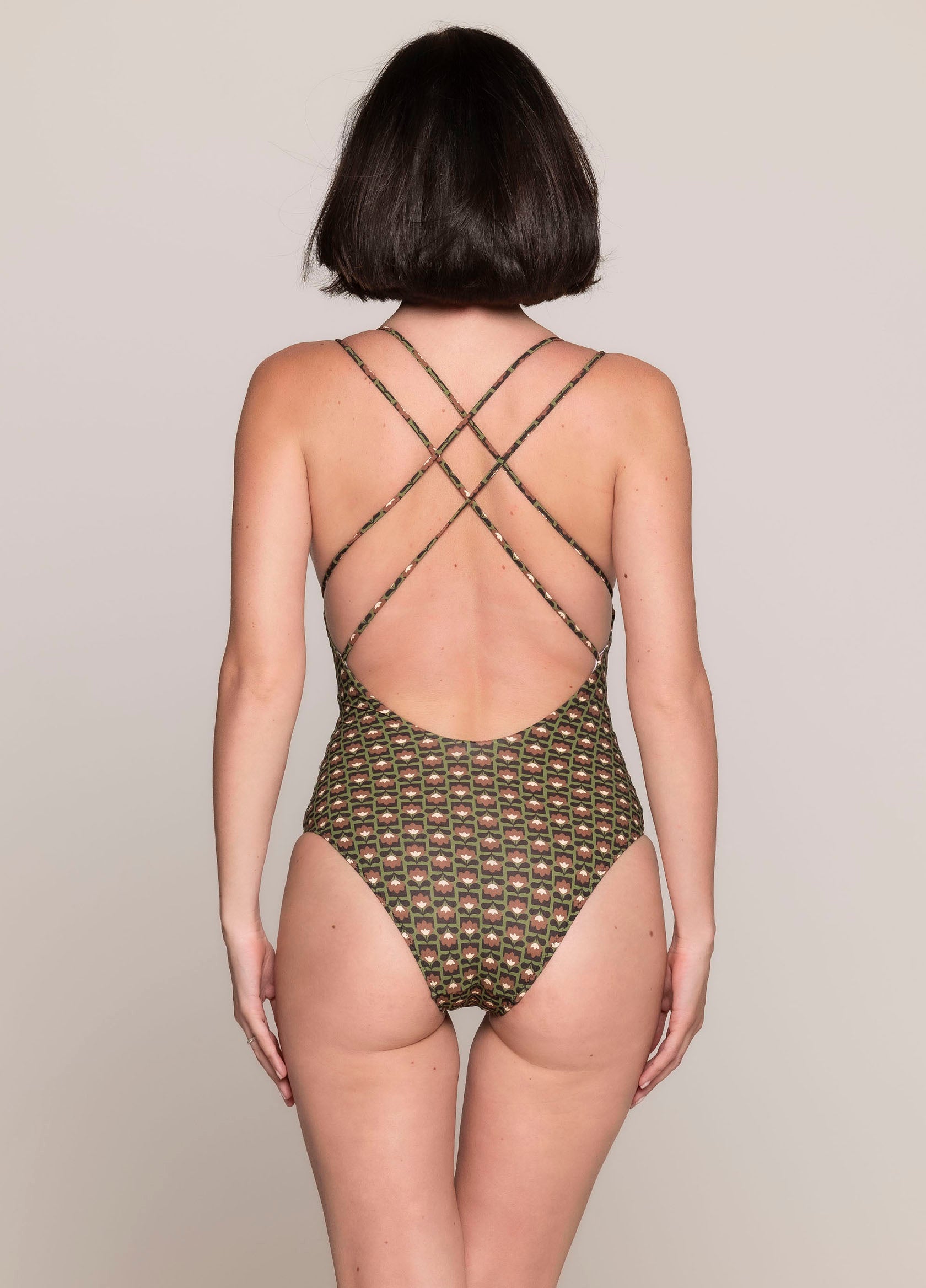 Intero con ampia scollatura a V e coppe dall’imbottitura removibile. Doppia spallina incrociata sulla schiena. Vestibilità regular sul retro.
