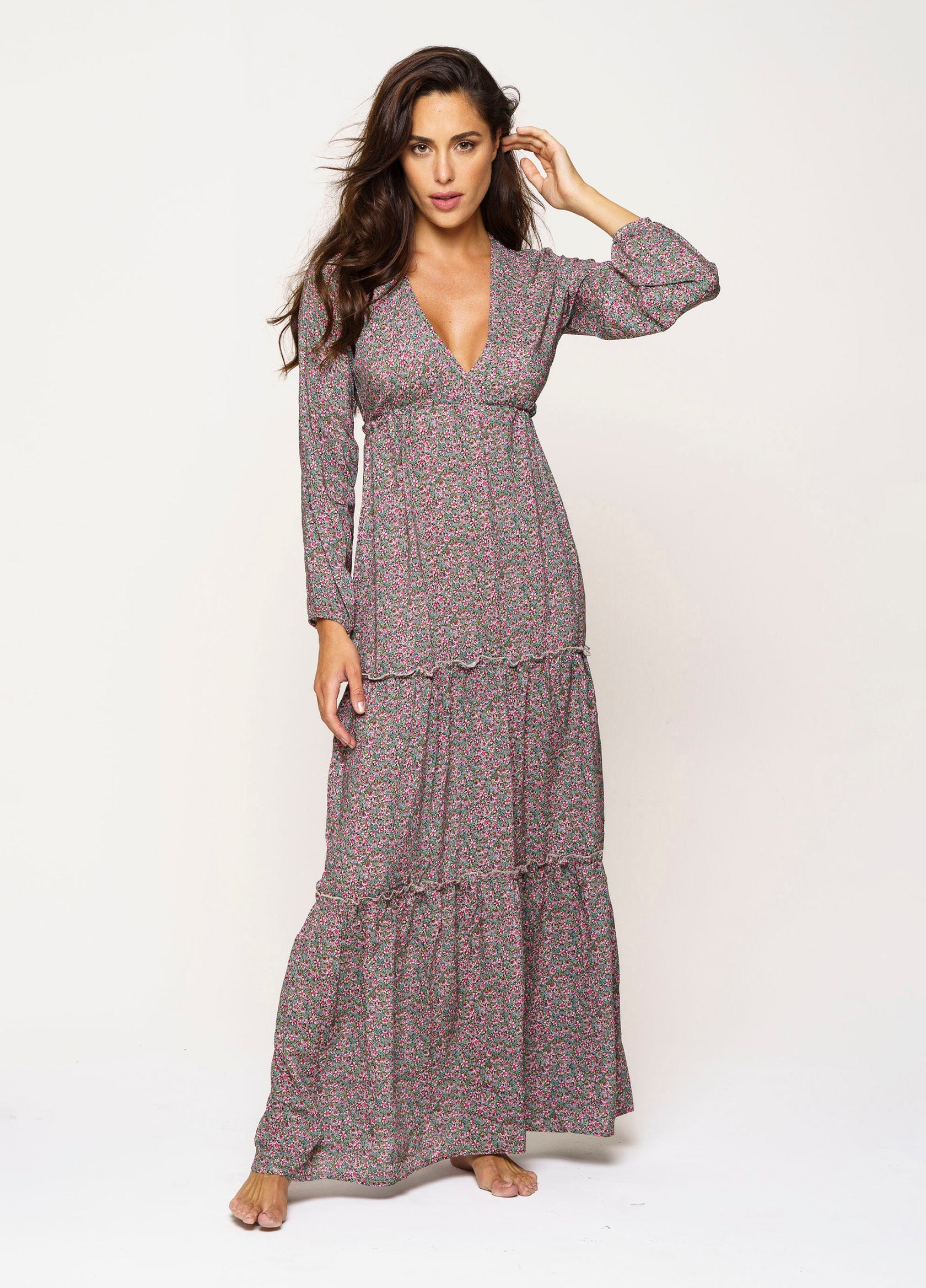 Abito con maniche lunghe ed ampia scollatura a V. Fantasia floreale liberty.