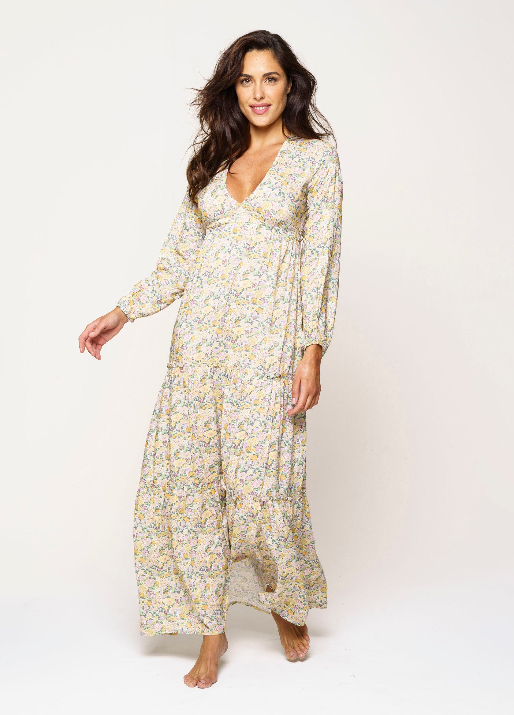Abito con maniche lunghe ed ampia scollatura a V. Fantasia floreale liberty.