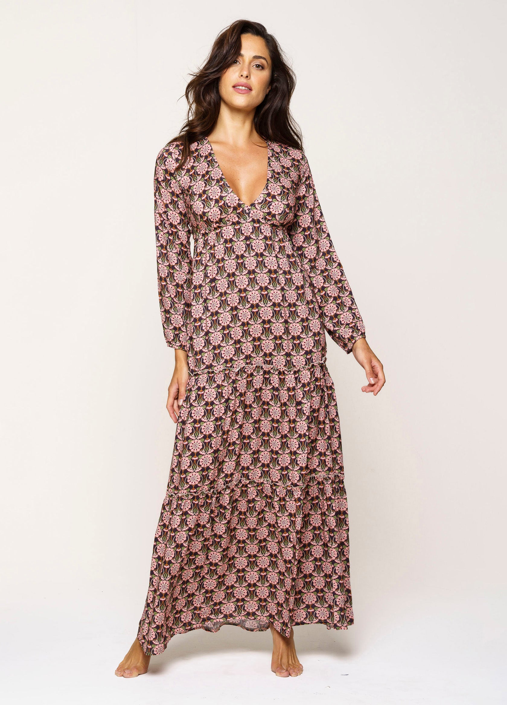 Abito con maniche lunghe ed ampia scollatura a V. Fantasia floreale liberty.