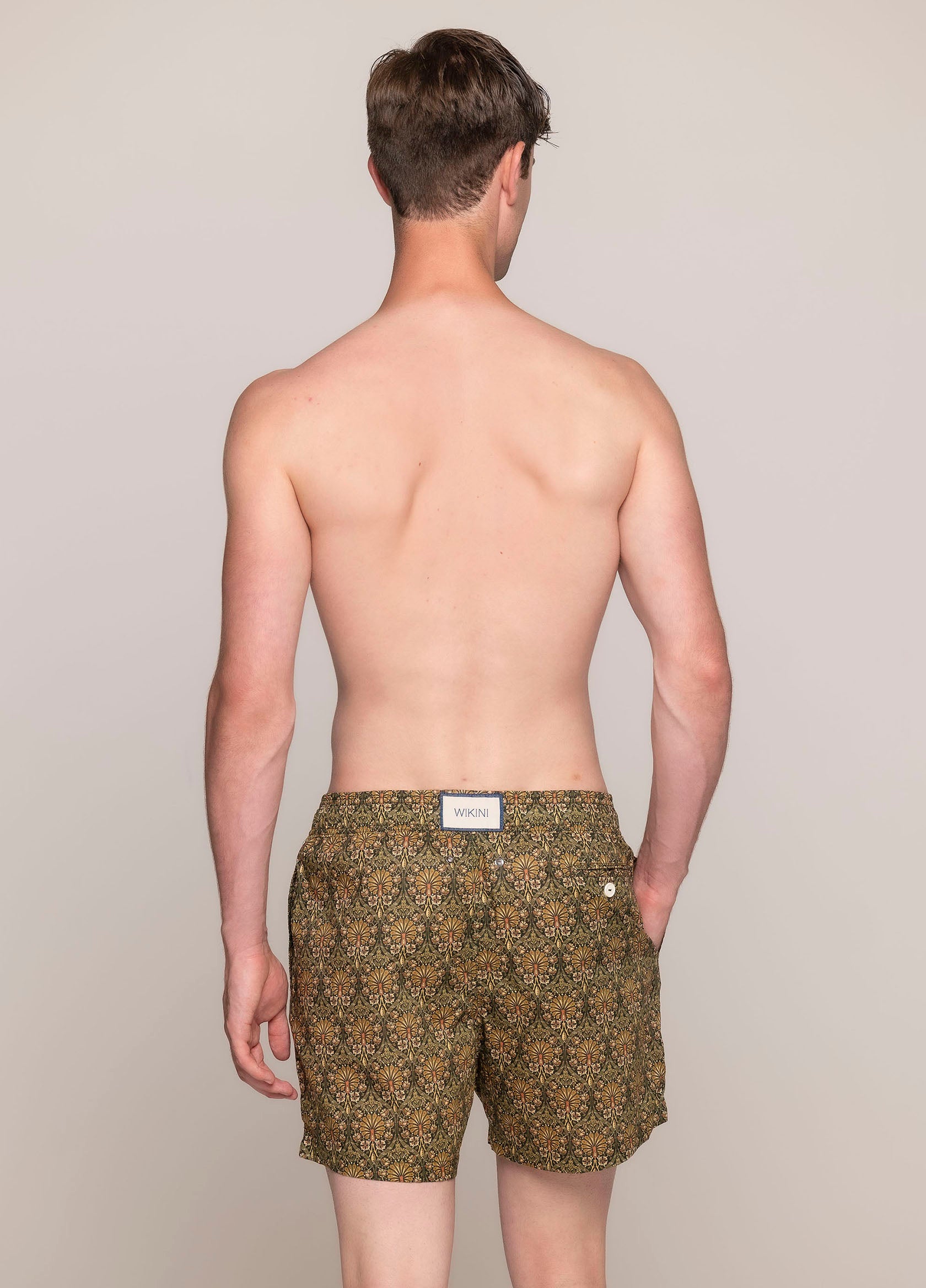 Costume da uomo a pantaloncino con elastico in vita e laccetto per regolare la vestibilità. Tasche laterali aperte ed una tasca posteriore con chiusura a bottone