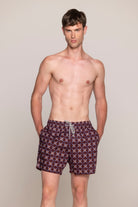 Costume da uomo a pantaloncino con elastico in vita e laccetto per regolare la vestibilità. Tasche laterali aperte ed una tasca posteriore con chiusura a bottone